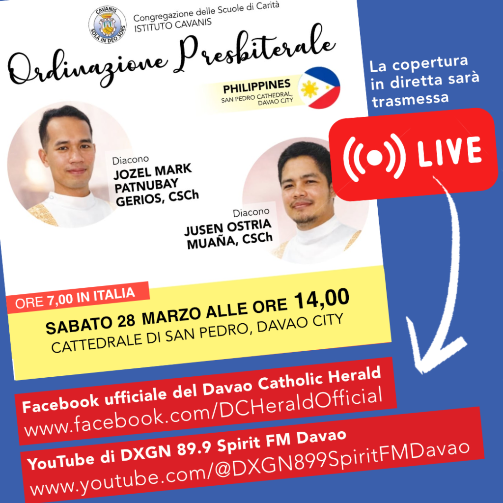 La Congregazione delle Scuole di Carità – Delegazione delle Filippine e di Timor Est – vi invita cordialmente all’Ordinazione Presbiterale del Rev. Jozel Mark Patnubay Gerios, CSCh e del Rev. Jusen Ostria Muaña, CSCh.